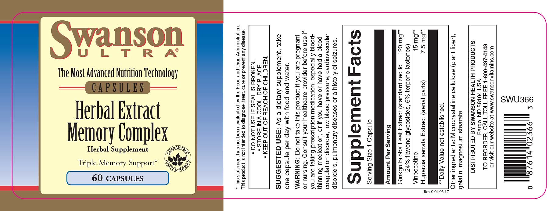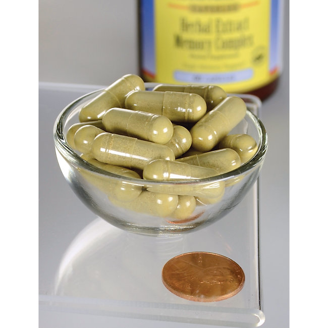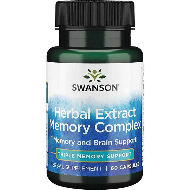 Swanson Herbal Extract Memory Complex je doplnok stravy, ktorý obsahuje extrakty z ginkgo biloby, vinpocentinu a huperzínu, známych pre svoje tradičné využitie v podpore kognitívnej funkcie.