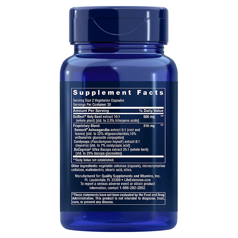 Sensoril® Ashwagandha (Withania somnifera) extrakt 5:1 (koreň a listy) [štd. do 32 % oligosacharidov, 10 % withanolidových glykozidových konjugátov] Cordyceps (Paecilomyces hepiali) extrakt 8:1 (mycélia) [štd. do 7 % kyseliny cordycepovej] extrakt BaCognize® Ultra (Bacopa monnieri) 25:1 (celá bylina) [štd. do 25 % bacopa glykozidov] Ďalšie zložky:rastlinná celulóza (kapsula), mikrokryštalická celulóza, maltodextrín, kyselina stearová, oxid kremičitý. |
