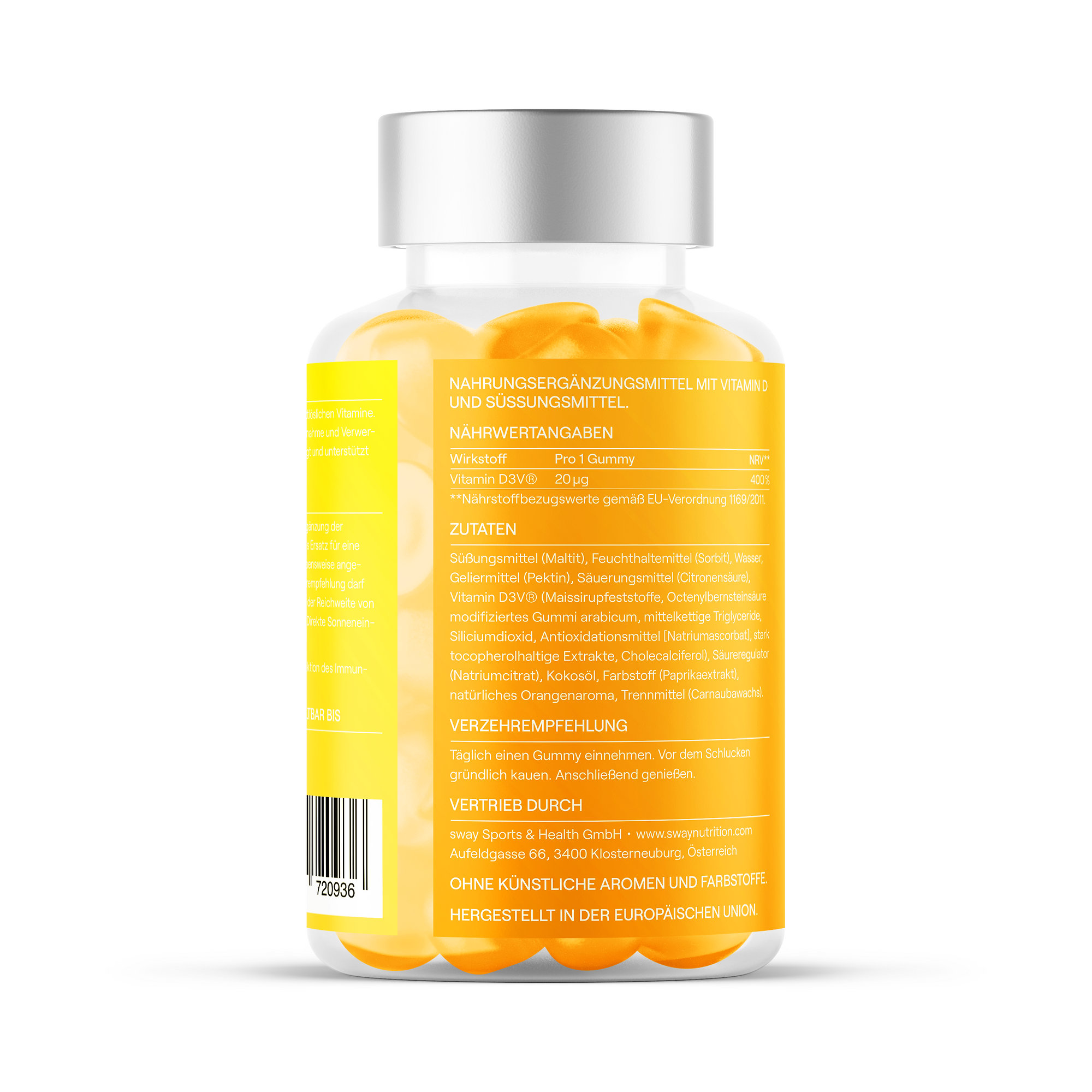 Sladidlo (maltitol) • zvlhčovadlo (sorbitol) • voda • želírujúca látka (pektín) • okysľovadlo (kyselina citrónová) • vitamín D3V® (sušina kukuričného sirupu, oktenyljantárová kyselina kyselinou modifikovaná arabská guma, triglyceridy so stredne dlhým reťazcom, oxid kremičitý, antioxidant (sodík askorbát), extrakty obsahujúce silné tokoferoly, cholekalciferol) • regulátor kyslosti (sodík citrát) • kokosový olej • farbivo (paprikový extrakt) • prírodná pomarančová aróma • protispekavá látka (karnaubský vosk)